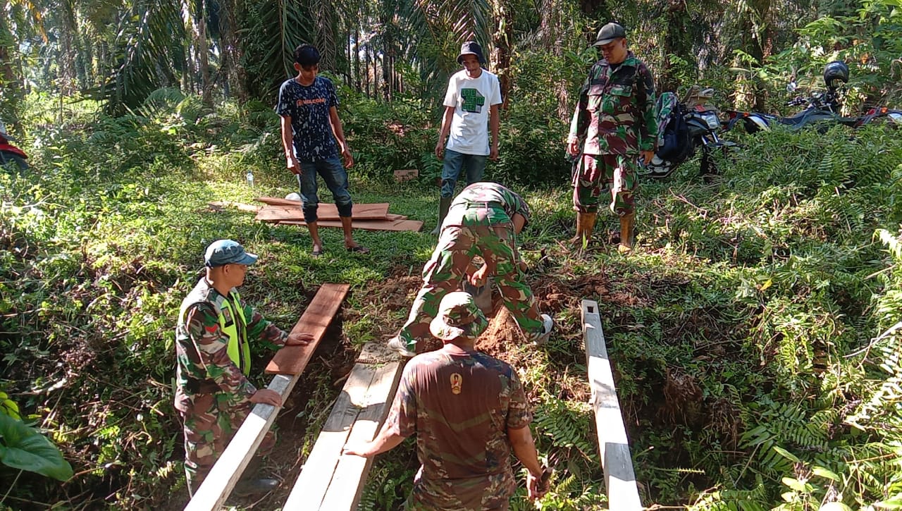 Terpantau di area perkebunan milik masyarakat di Desa Alue Jampak Kecamatan Darul Makmur Kabupaten Nagan Raya, penuh semangat dan kelihatan kompak Babinsa bersama masyarakat menyelesaikan jembatan dari kayu diatas irigasi yang mengaliri di kebun sawit.