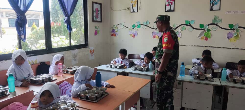 Bintara Pembina Desa (Babinsa) Koramil 04/Susoh Kodim 0110/Abdya Sertu Asrul, meninjau pelaksanaan program Makan Bergizi Gratis (MBG) di sejumlah sekolah dasar di wilayah Kecamatan Susoh, Selasa (14/10/2025).