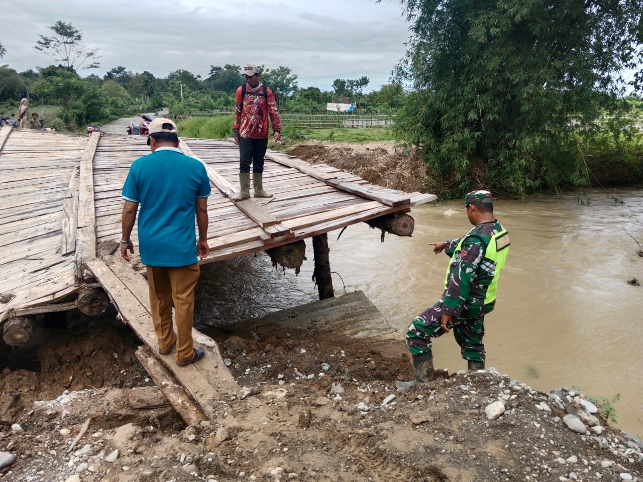 Nagan Raya – Babinsa Koramil 03/Senagan Timur Kodim 0116/Nagan Raya bersama Keuchik dan masyarakat setempat memantau secara langsung kondisi jembatan yang mengalami kerusakan cukup parah akibat diterjang banjir.