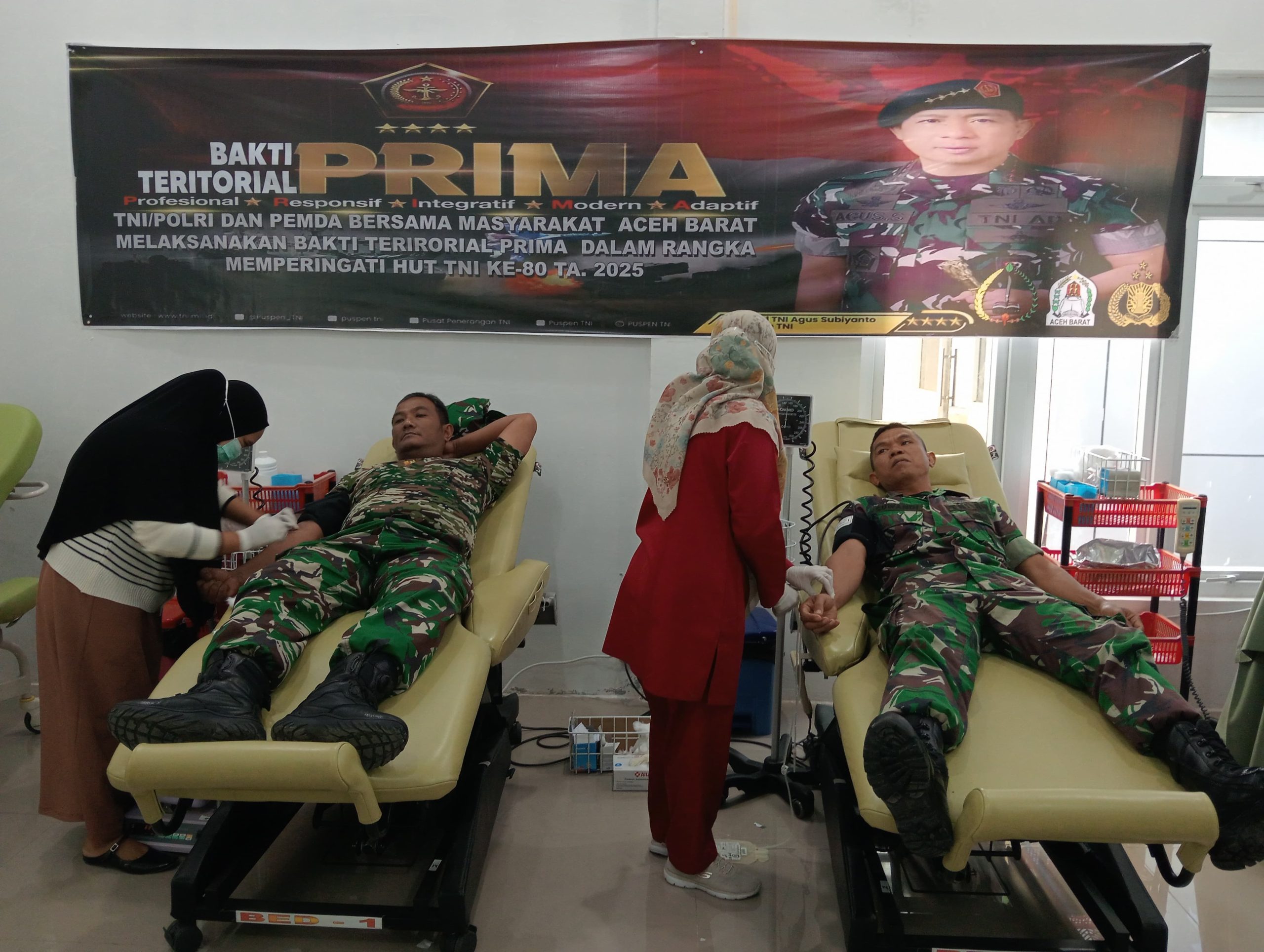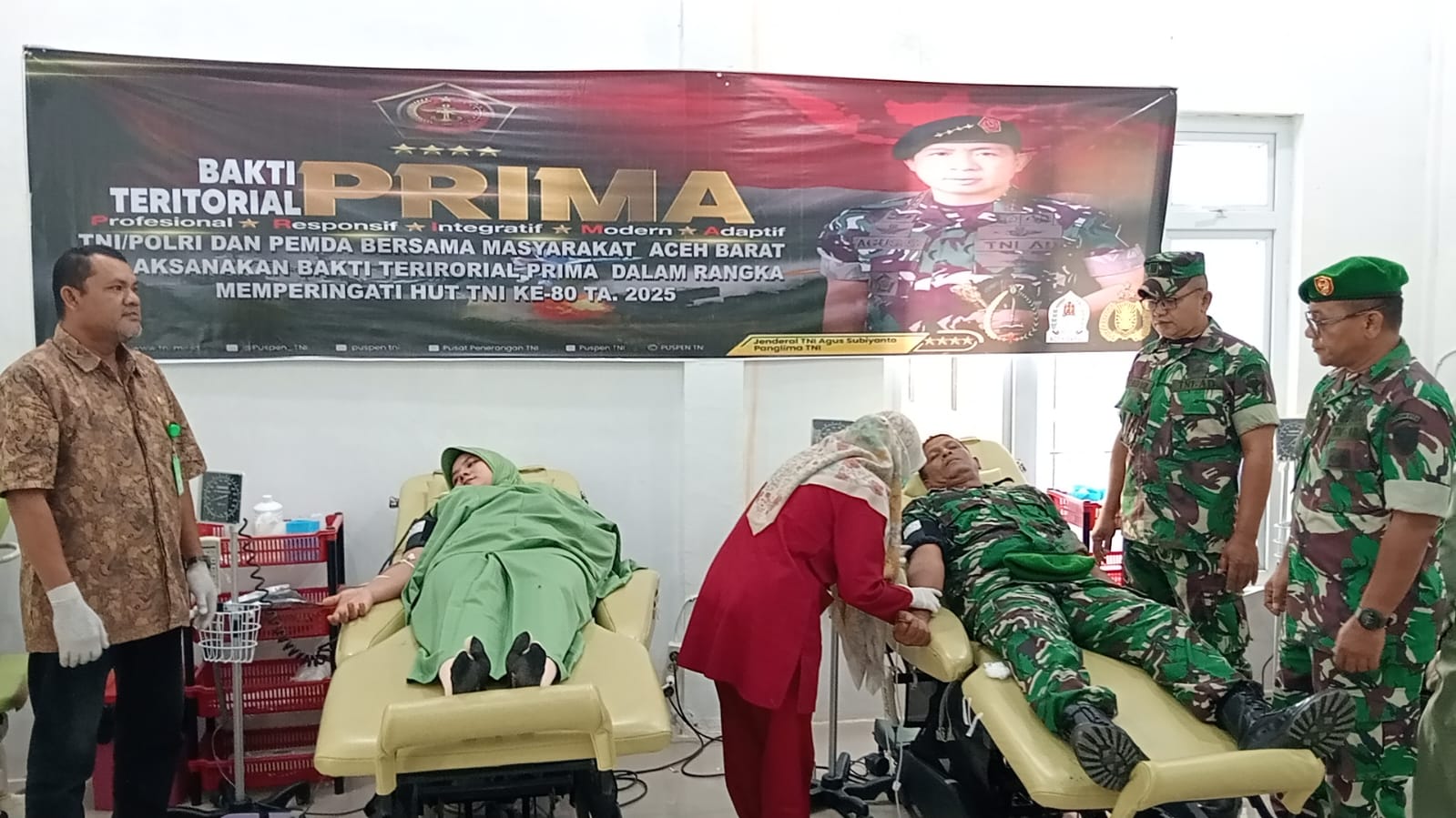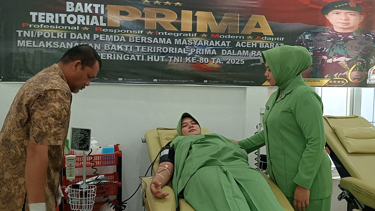 Johan Pahlawan, Sabtu (20/9/2025) — Dalam rangka menyambut Hari Ulang Tahun (HUT) TNI ke-80 yang jatuh pada 5 Oktober 2025, Satuan jajaran Korem 012/Teuku Umar menggelar kegiatan donor darah yang melibatkan prajurit TNI dan Persit dari Kodim 0105/Abar. Acara ini dilaksanakan pada Sabtu, 20 September 2025, bertempat di Rumah Sakit Umum Daerah (RSUD) Cut Nyak Dhien, Jalan Gajah Mada, Desa Drien Rampak, Kecamatan Johan Pahlawan.