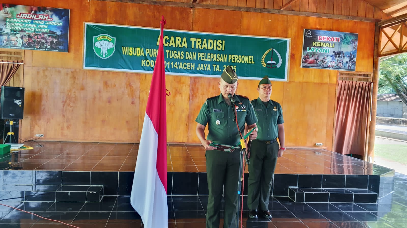 ACEH JAYA – Dandim 0114/Aceh Jaya Letkol Inf Alimudin, S.E., Pimpin Acara tradisi Wisuda Purna tugas Peltu T.Adlin diarsa dan Serma Nasri serta pelepasan Letda Inf Alfin Alfiansyah ke Kodam I/BB. Dan Serka Ari Fajdiansyah Ke Sansi Dam IM Prosesi acara tradisi digelar di Joglo Makodim setempat, Desa Bahagia , Kecamatan Krueng Sabee,Rabu (30/07/2025)