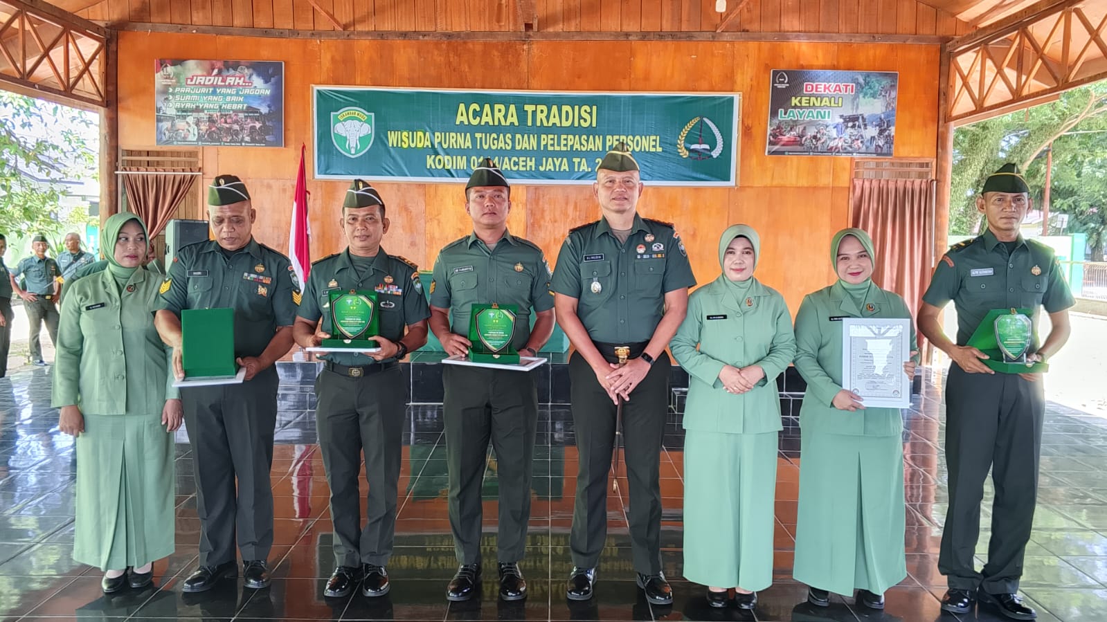 “Kepada personil yang telah Wisuda Purna Tugas, saya ucapkan selamat dan trimakasi atas Dedikasi dan apresiasi atas pengabdian serta Darma Bhaktinya selama berdinas di Kodim 0114/Aceh Jaya, Serta tertap menjaga tali silaturahmi agar tidak tertputus”,tegas Dandim