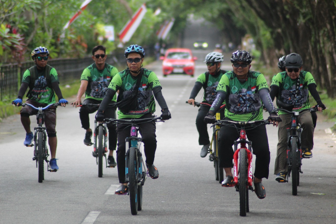 Ratusan pesepeda se- Aceh dan lokal Aceh Barat Daya (Abdya) mengikuti gowes bareng di event Jelajah Bumoe Sigupai dalam rangka menyemarakkan hari ulang tahun (HUT) ke-80 Republik Indonesia, Minggu (11/8/2025).