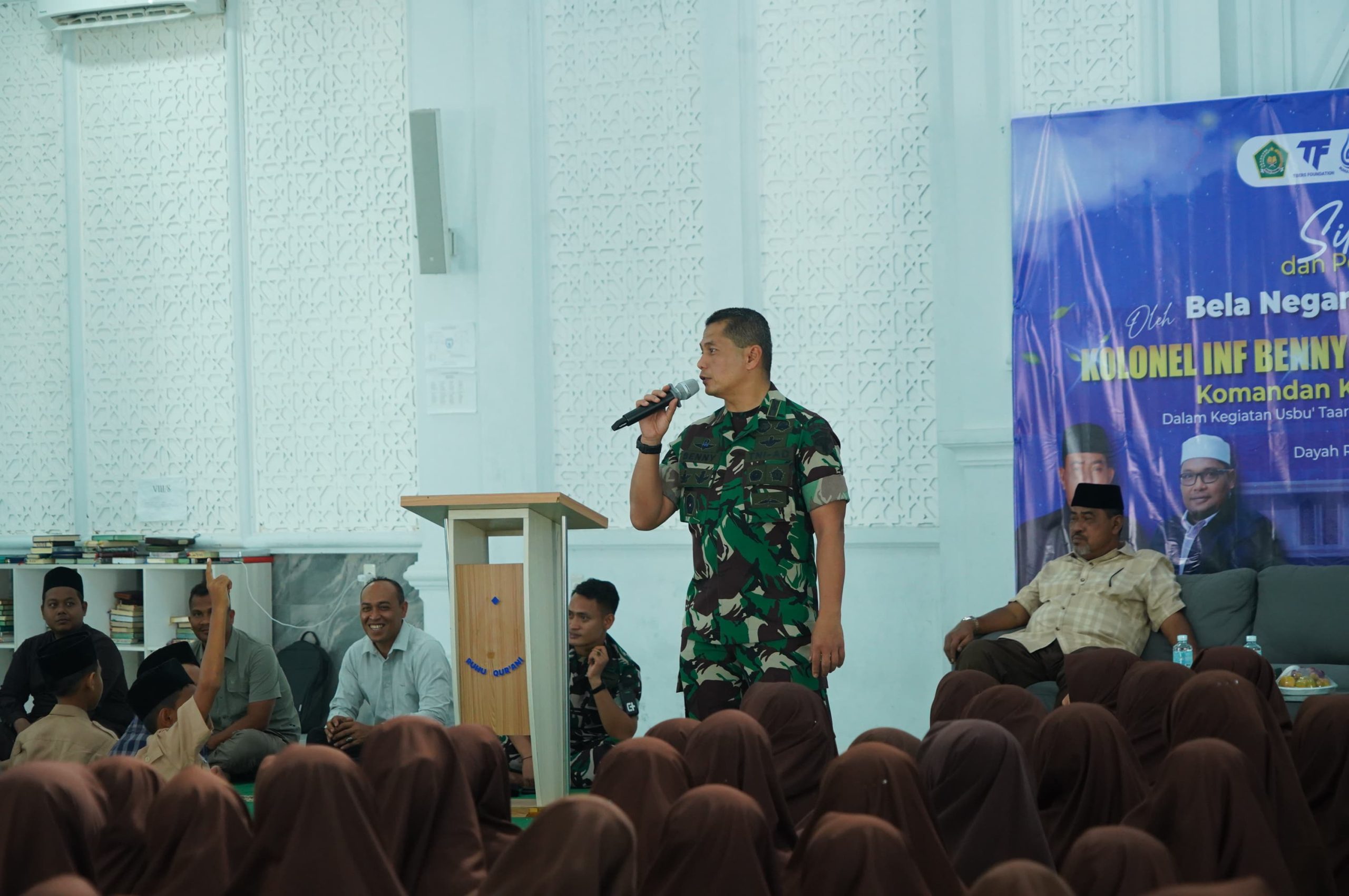Aceh Barat, Sabtu (19/07/2025) — Komandan Korem 012/Teuku Umar, Kolonel Inf Benny Rahadian, S.E., M.Han., memberikan pembekalan kepemimpinan dan bela negara kepada ratusan santriwan dan santriwati Dayah Ruhul Qur’ani.