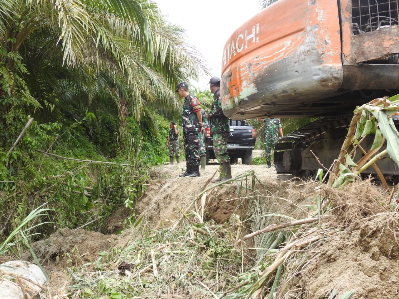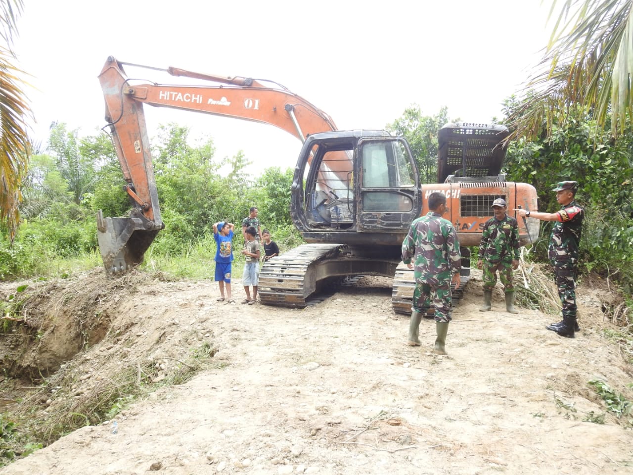 Dengan menggunakan alat berat jenis excavator, Satgas TMMD bersama warga bahu membahu membuka jalan baru yang sebelumnya tertutup semak belukar. Masyarakat sekitar, termasuk anak-anak, tampak antusias menyaksikan jalannya pekerjaan, sebagai bukti dukungan terhadap pembangunan di wilayah mereka.