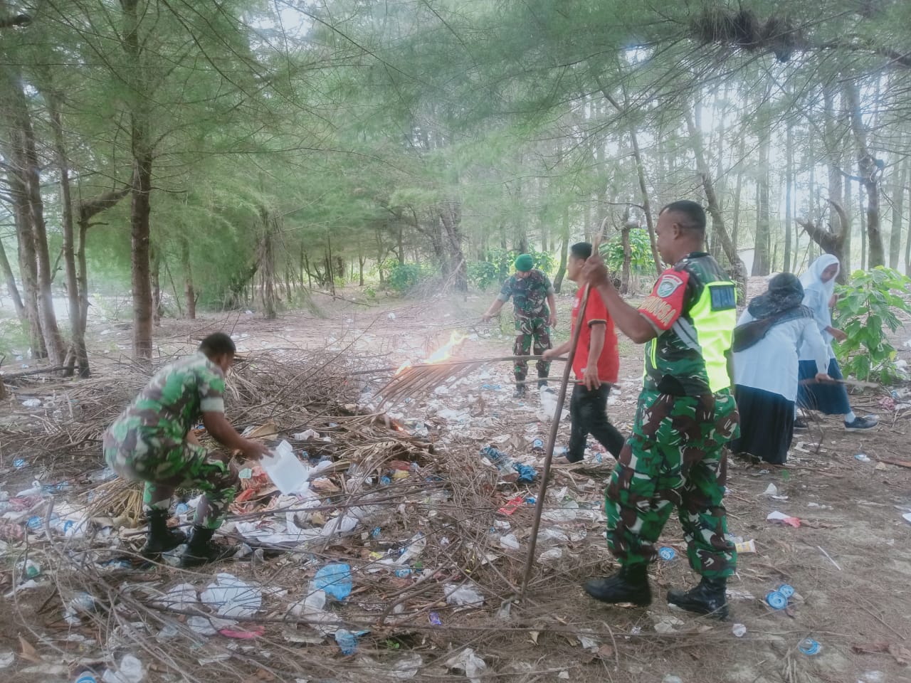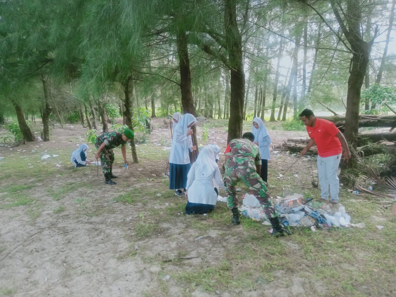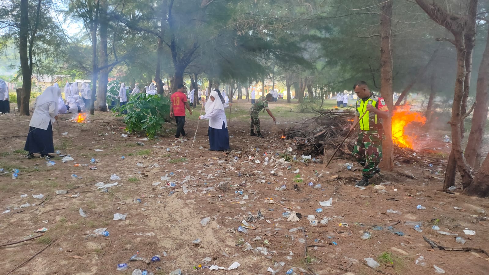 Dengan alat seadanya, para personel TNI,Muspika guru dan siswa-Siswi warga bahu membahu membersihkan lapangan, yang ditpenuhi sampah pelastik,dan sampah yang beserakan,berjalan dengan lancar dan nyaman.