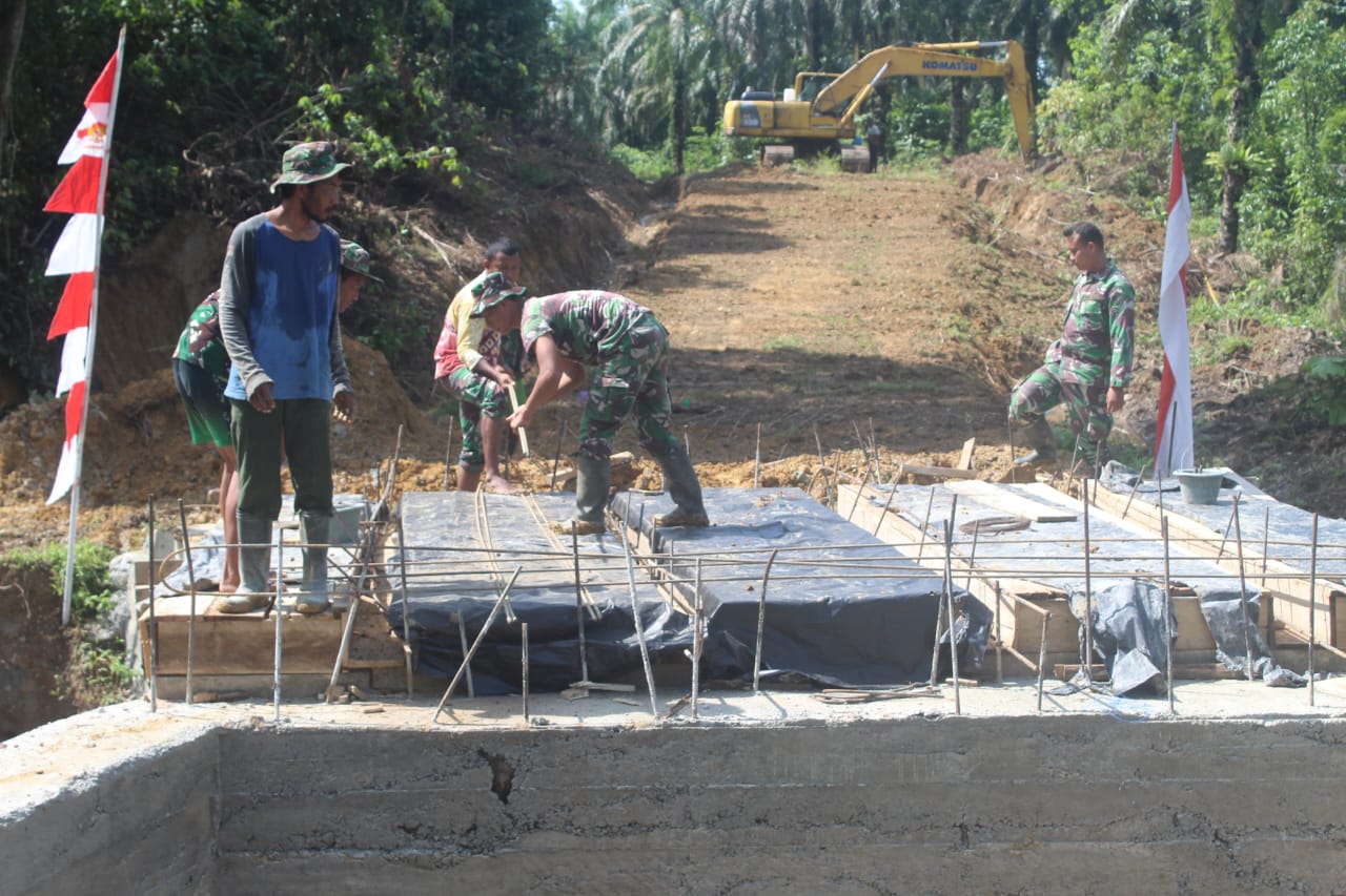 Nagan Raya, Satgas Tentara Manunggal Masuk Desa (TMMD) Reguler ke-120 Kodim 0116/Nagan Raya mulai kerjakan pemasangan rangka besi cor untuk jembatan batas Desa antara Desa Kota Baro Blang Muling dan Desa Alue Gajah Kecamatan Suka Makmue Kabupaten Nagan Raya, Senin (27/05/2024).