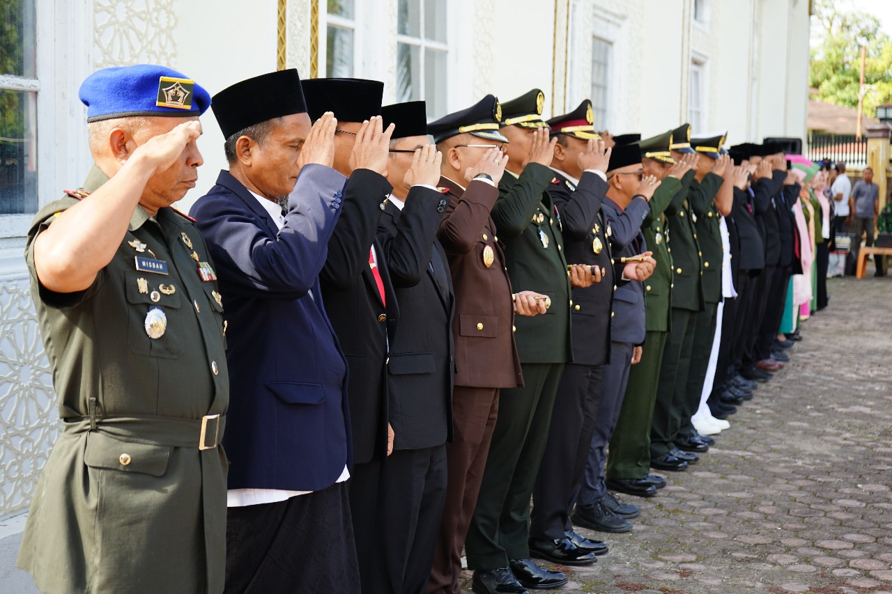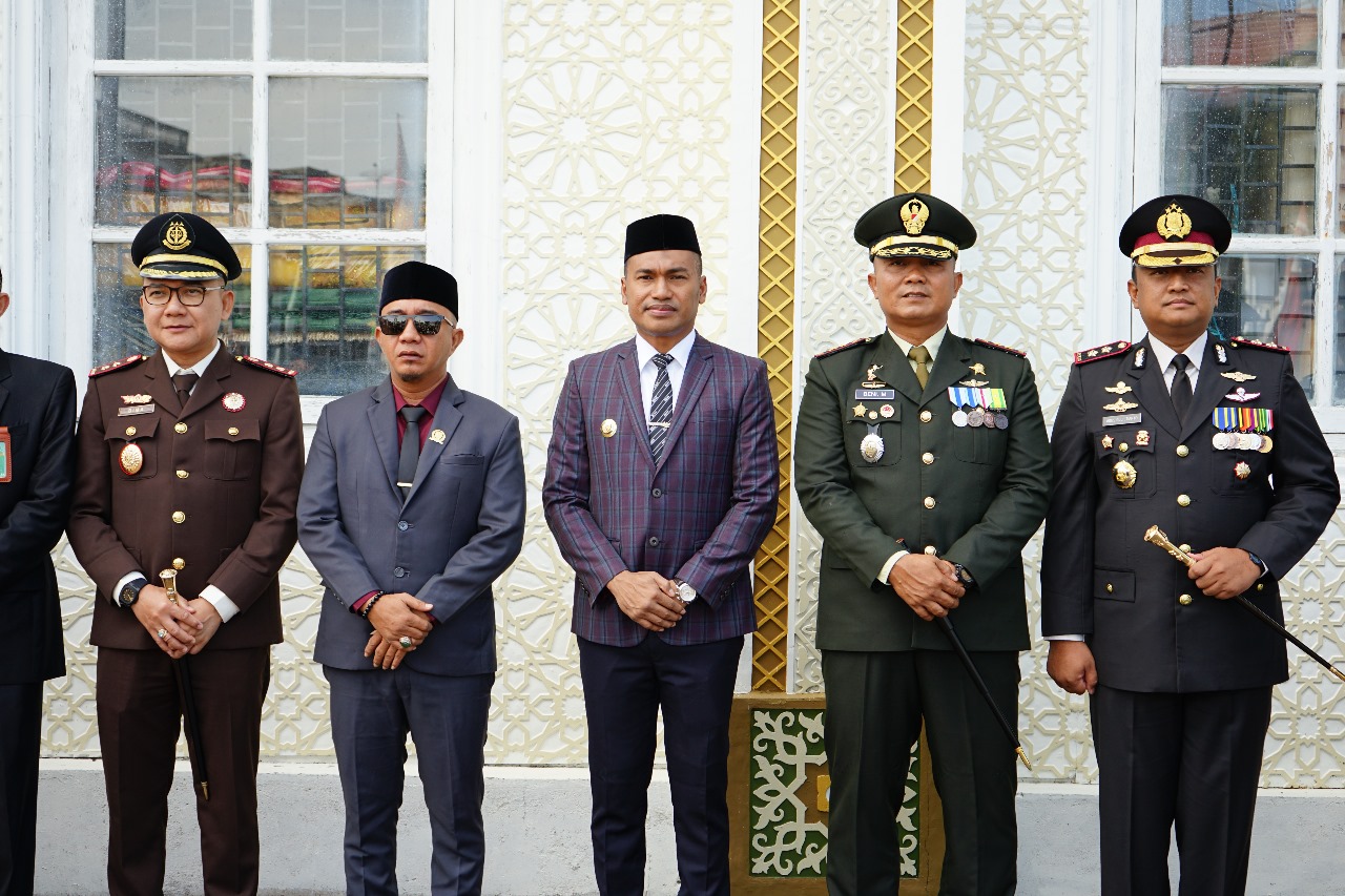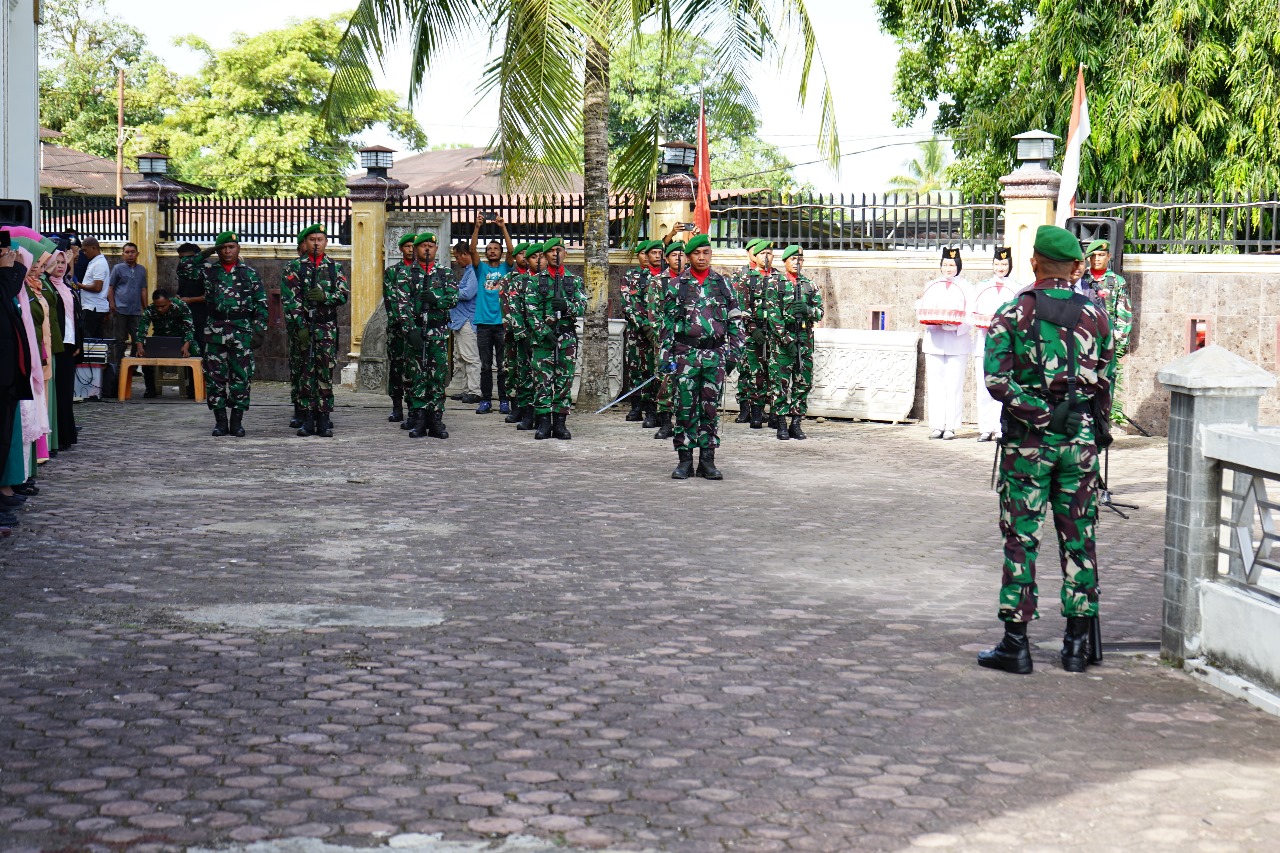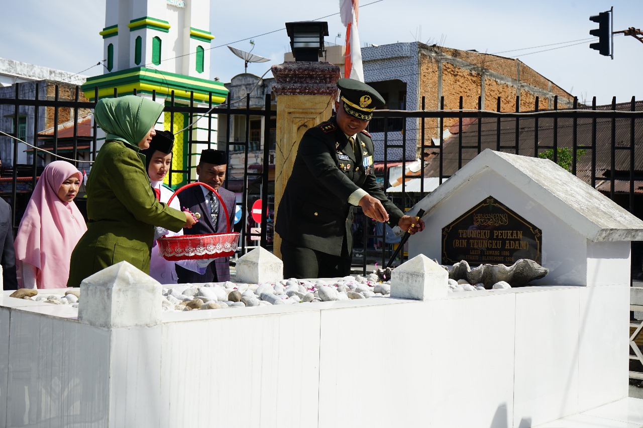 Komandan Kodim (Dandim) 0110/Abdya Letkol Inf Beni Maradona, S.Sos bersama jajaran Forum Koordinasi Pimpinan Daerah (Forkopimda) mengikuti upacara ziarah ke makam pahlawan Tengku Peukan di Kompleks Masjid Jamik Baitul Adhim, Desa Pasar, Kecamatan Blangpidie, Sabtu (16/8/2025) pagi.