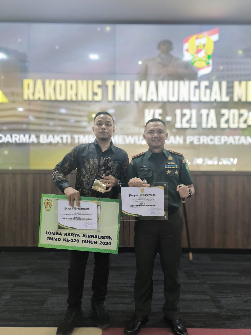 Aceh Barat – Kodim 0105/Abar menorehkan prestasi gemilang dengan meraih Juara 3 dalam ajang Lomba Karya Jurnalistik TMMD Reguler ke – 120 TA. 2024. Penghargaan tersebut diterima langsung oleh penulis berita Subur Dani didampingi Dandim 0105/Abar Letkol Inf Hendra Mirza, S.E., M.Si., pada saat acara Rakornis TMMD di Gedung AH Nasution Mabes TNI AD Jakarta, Rabu (10/7/2024)