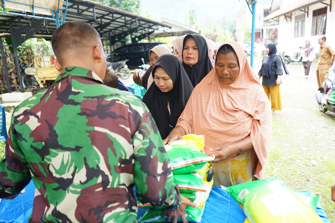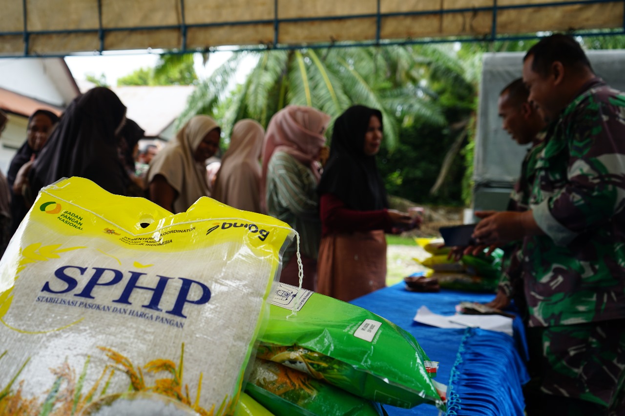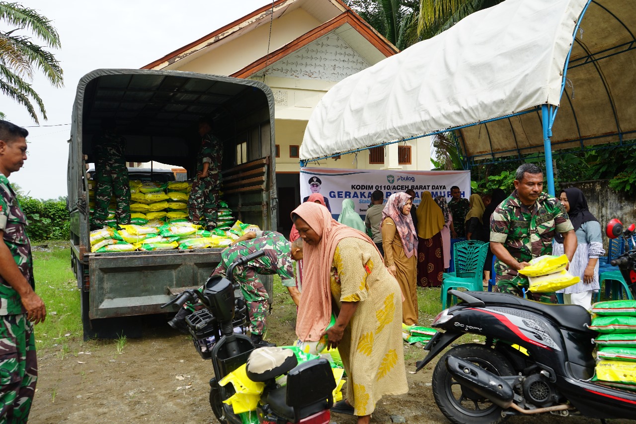 Kodim 0110/Abdya bekerja sama dengan Perum Bulog menggelar pasar pangan murah di halaman Kantor Camat Kuala Batee, Desa Pasar Kuta Bahagia, Senin (11/8/2025).