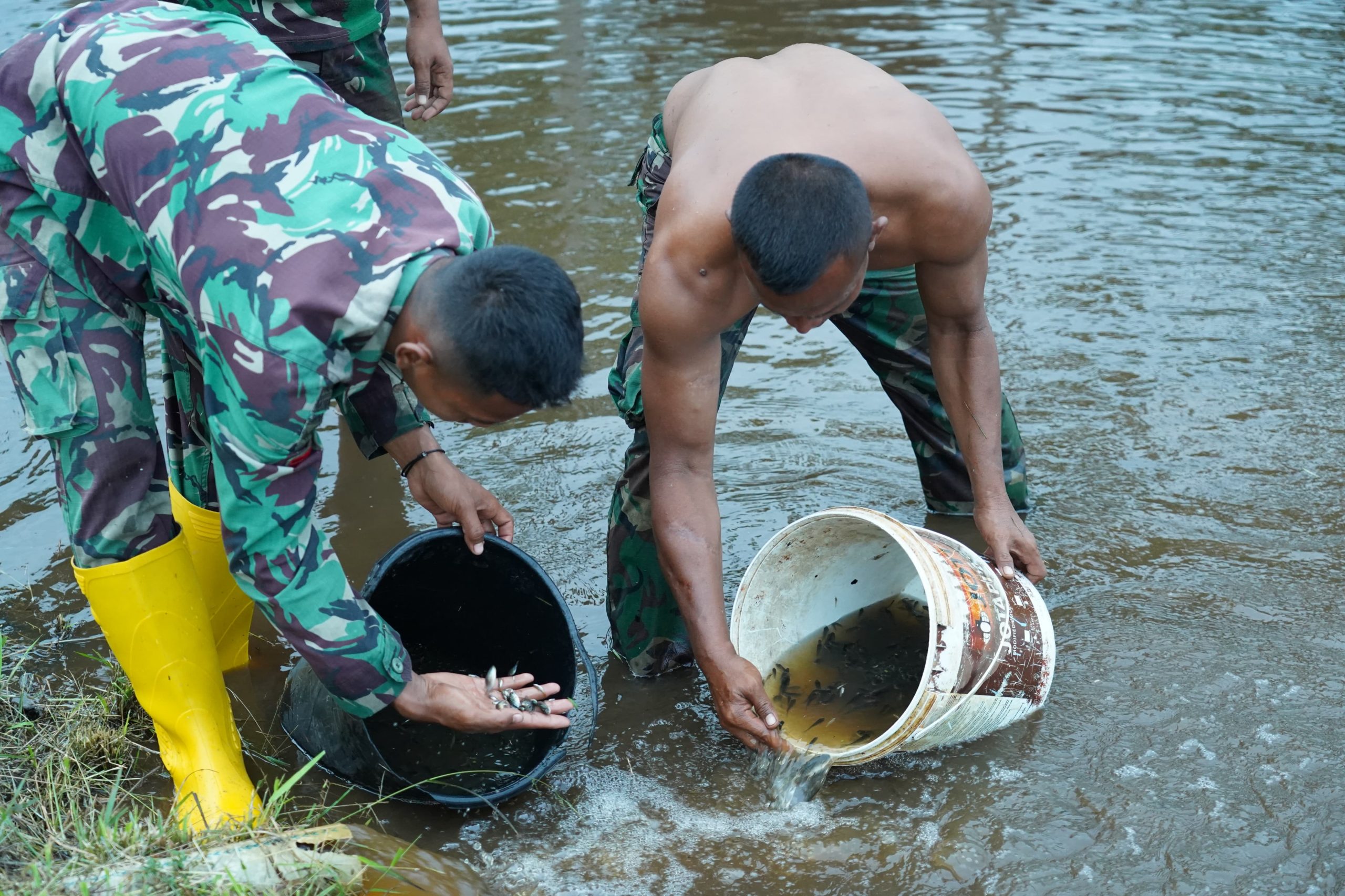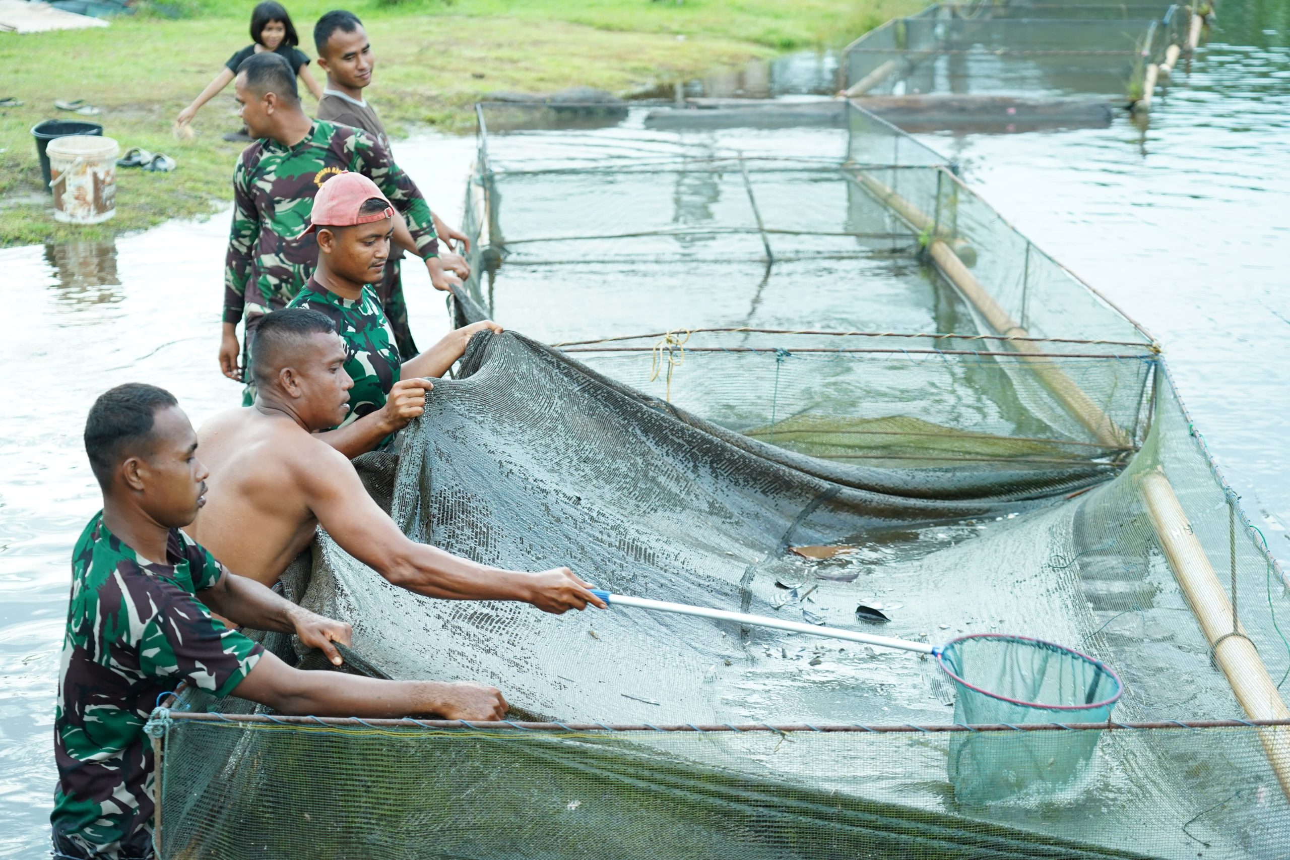 Selain pembibitan, program ketahanan pangan ini juga mencakup proses pembesaran ikan nila. Prajurit secara rutin melakukan penyortiran bibit untuk dipindahkan ke kolam pembesaran, sehingga menghasilkan ikan dengan ukuran yang seragam dan siap panen.