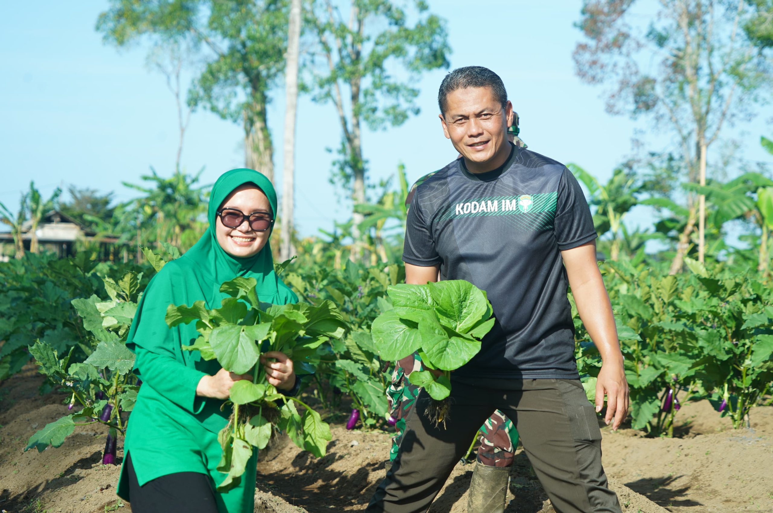 Komandan Korem (Danrem) 012/Teuku Umar Kolonel Inf Benny Rahadian, S.E., M.Han, didampingi Ketua Persit KCK Koorcabrem 012 PD Iskandarmuda Ny. Rina Benny Rahadian memimpin langsung kegiatan panen raya dikebun Hanpangan Korem 012/TU.