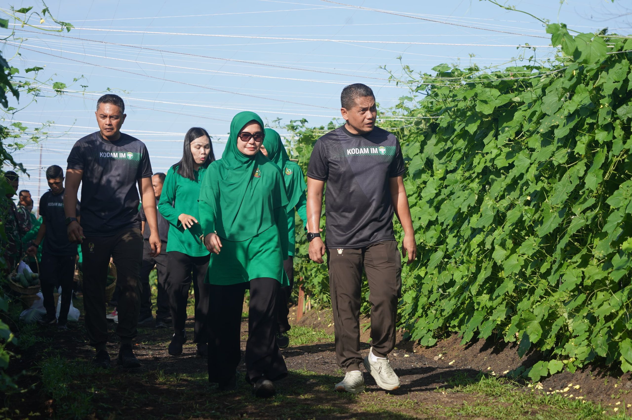 Komandan Korem (Danrem) 012/TU Kolonel Inf Benny Rahadian, S.E., M.Han., didampingi Ketua Persit KCK Koorcabrem 012 Ny. Rina Benny Rahadian, memimpin kegiatan panen bersama di kebun ketahanan pangan yang terletak di Desa Alue Peunyaring, Kecamatan Meureubo, Kabupaten Aceh Barat.