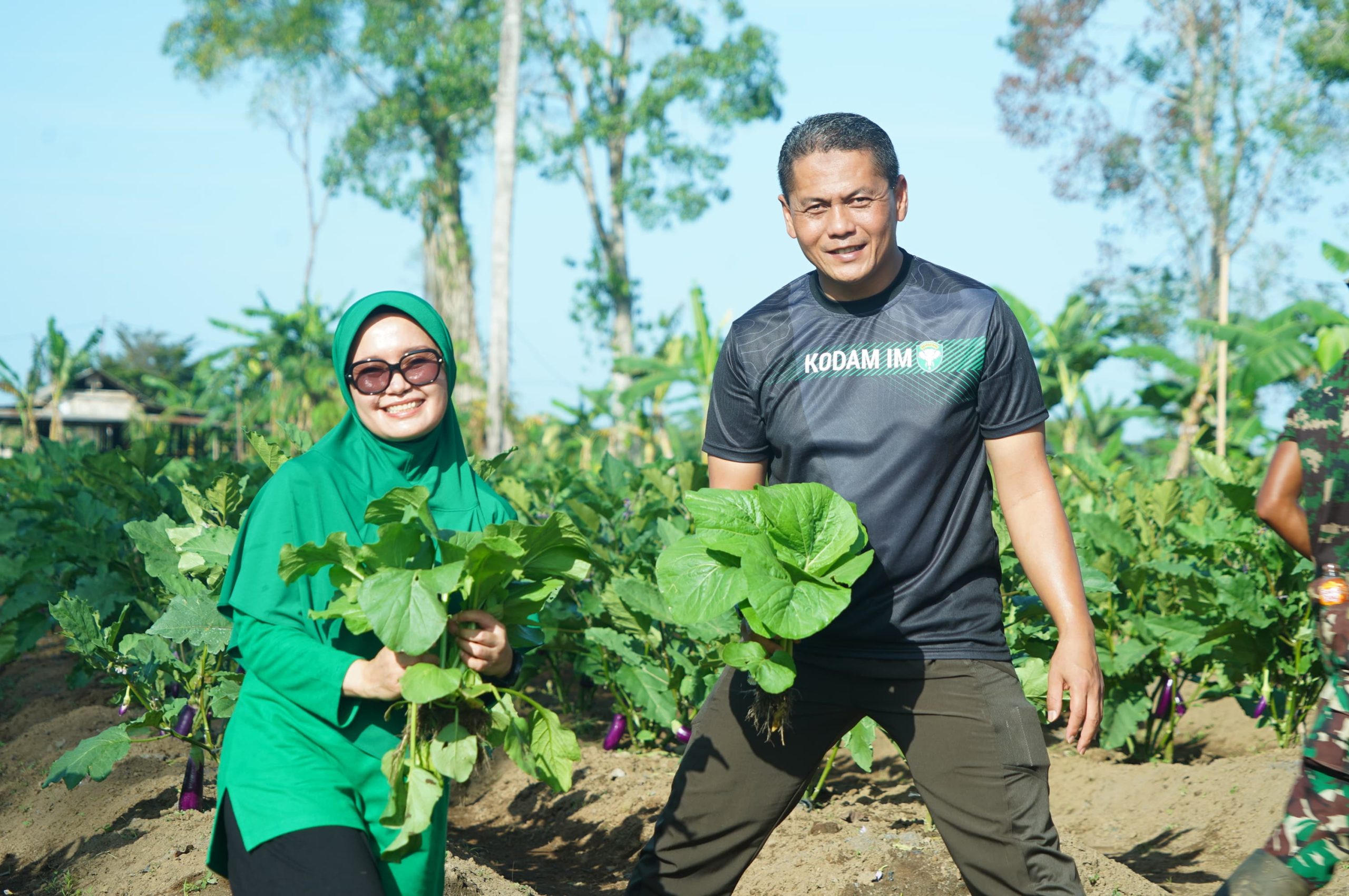 Komandan Korem (Danrem) 012/TU Kolonel Inf Benny Rahadian, S.E., M.Han., didampingi Ketua Persit KCK Koorcabrem 012 Ny. Rina Benny Rahadian, memimpin kegiatan panen bersama di kebun ketahanan pangan yang terletak di Desa Alue Peunyaring, Kecamatan Meureubo, Kabupaten Aceh Barat.