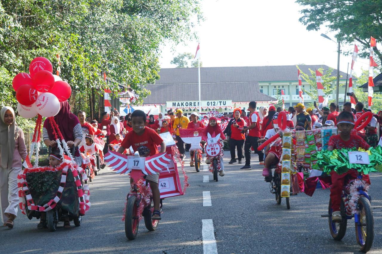 Untuk kategori anak-anak, panitia menghadirkan lomba Menggiring Bola dengan Muka ditutup Corong, lomba memasukkan bola ke dalam botol, lomba makan kerupuk, Sementara itu, kategori prajurit dan persit memindahkan tepung, titian bambu yang mengundang tawa penonton dan juga lomba sepeda hias yang menambah meriah HUT RI ke 80.