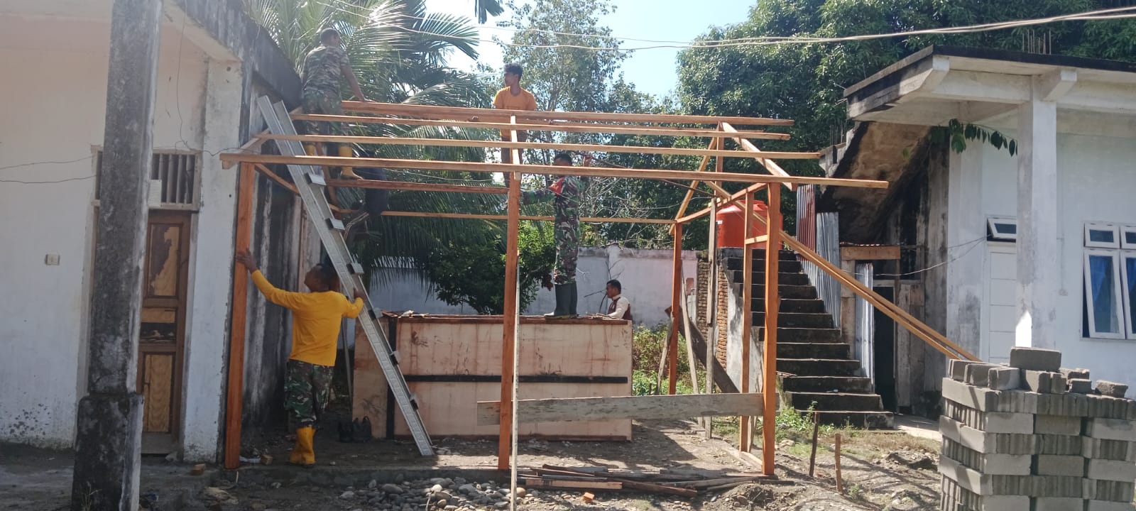 Tampak personel Babinsa dan masyarakat bahu-membahu membangun fasilitas tempat wudhu di salah satu Pondok Pasantren (Ponpes) yang ada di Desa Pucuk Kreung.