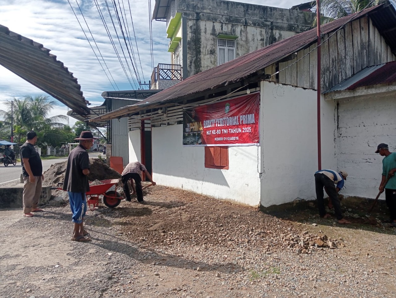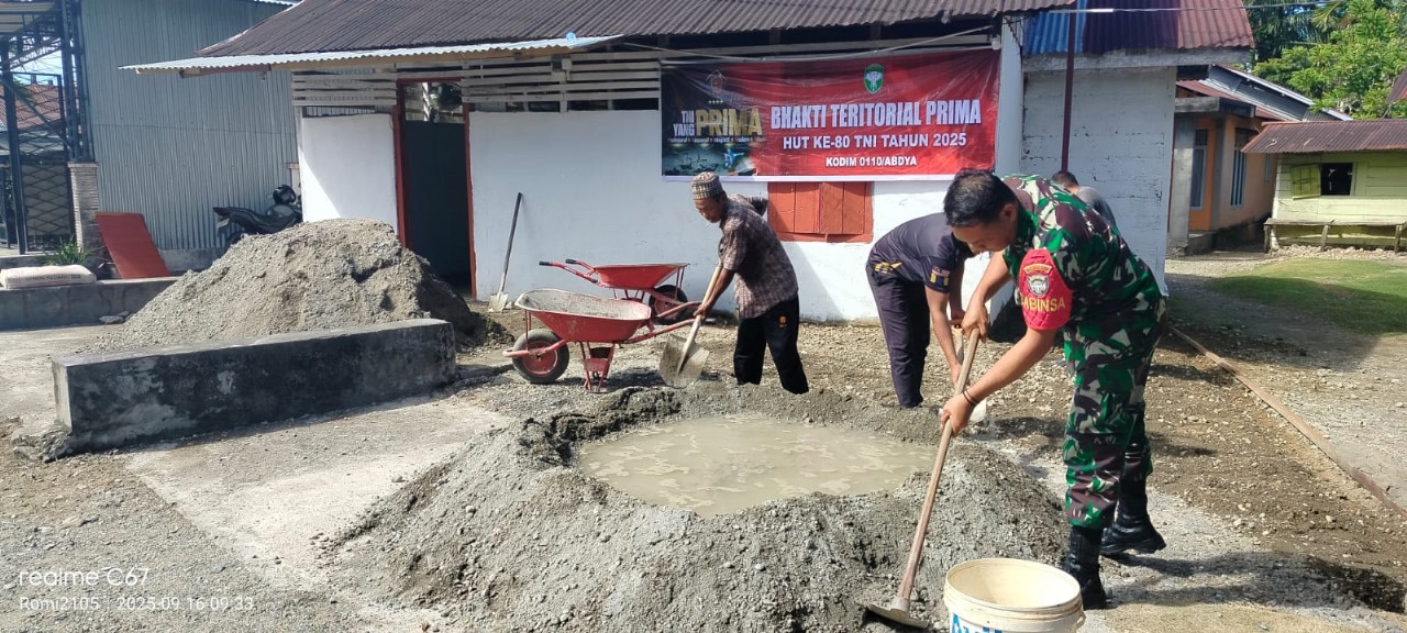 Dalam rangka menyambut Hari Ulang Tahun ke-80 Tentara Nasional Indonesia (TNI), personel Kodim 0110/Aceh Barat Daya (Abdya) bersama masyarakat melaksanakan kegiatan pengecoran (semenisasi) di Dayah Nur Nyak Dah, Desa Gunung Cut, Kecamatan Tangan-Tangan, Selasa (16/9/2025).
