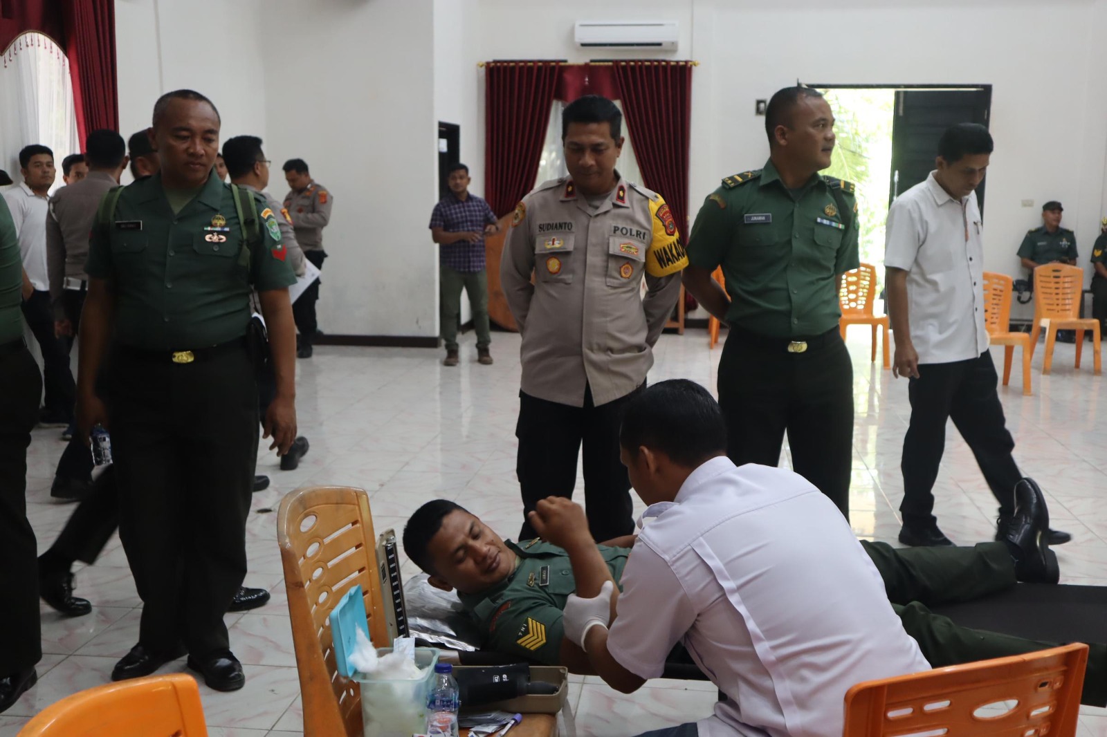 Nagan Raya, Personel Kodim 0116/Nagan Raya turut berpartisipasi mengikuti kegiatan donor Darah dalam rangka memperingati HUT ke-78 Bhayangkara di Polres Nagan Raya, Rabu (26/06/2024).