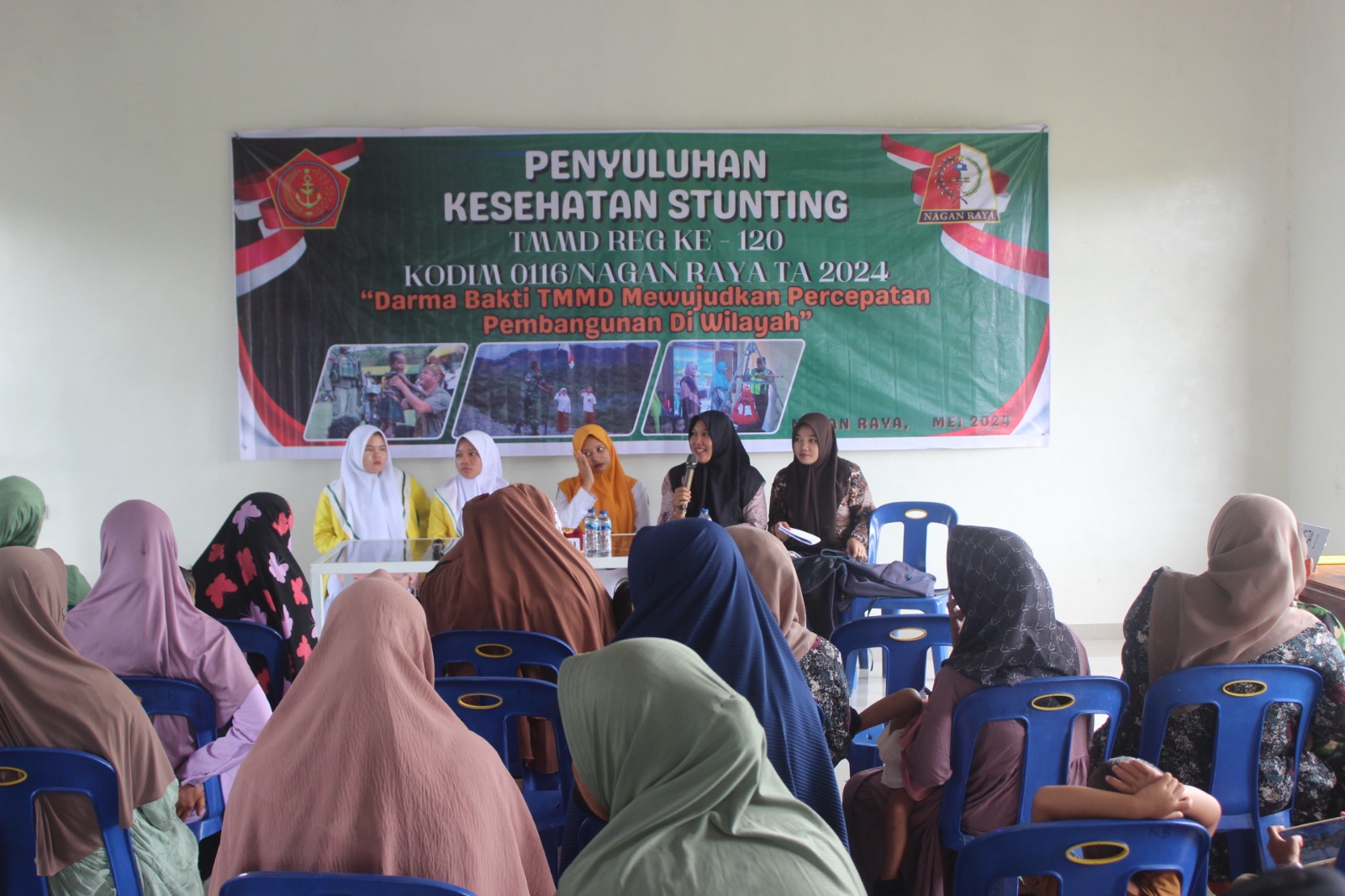 Nagan Raya, Target penurunan prevalensi stunting, di Kabupaten Nagan Raya Satuan Tugas (Satgas) Tentara Manunggal Membangun Desa (TMMD) Reguler ke-120 Kodim 0116/Nagan Raya dan Persit Kartika Chandra Kirana Cabang XL Dim 0116/Nara bekerjasama sama dengan Dinas Kesehatan melakukan penyuluhan stunting, Posyandu, Posbindu BTM, Stunting di Kantor Keuchik Desa Kota Baro Blang Muling, Kamis (16/05/24).