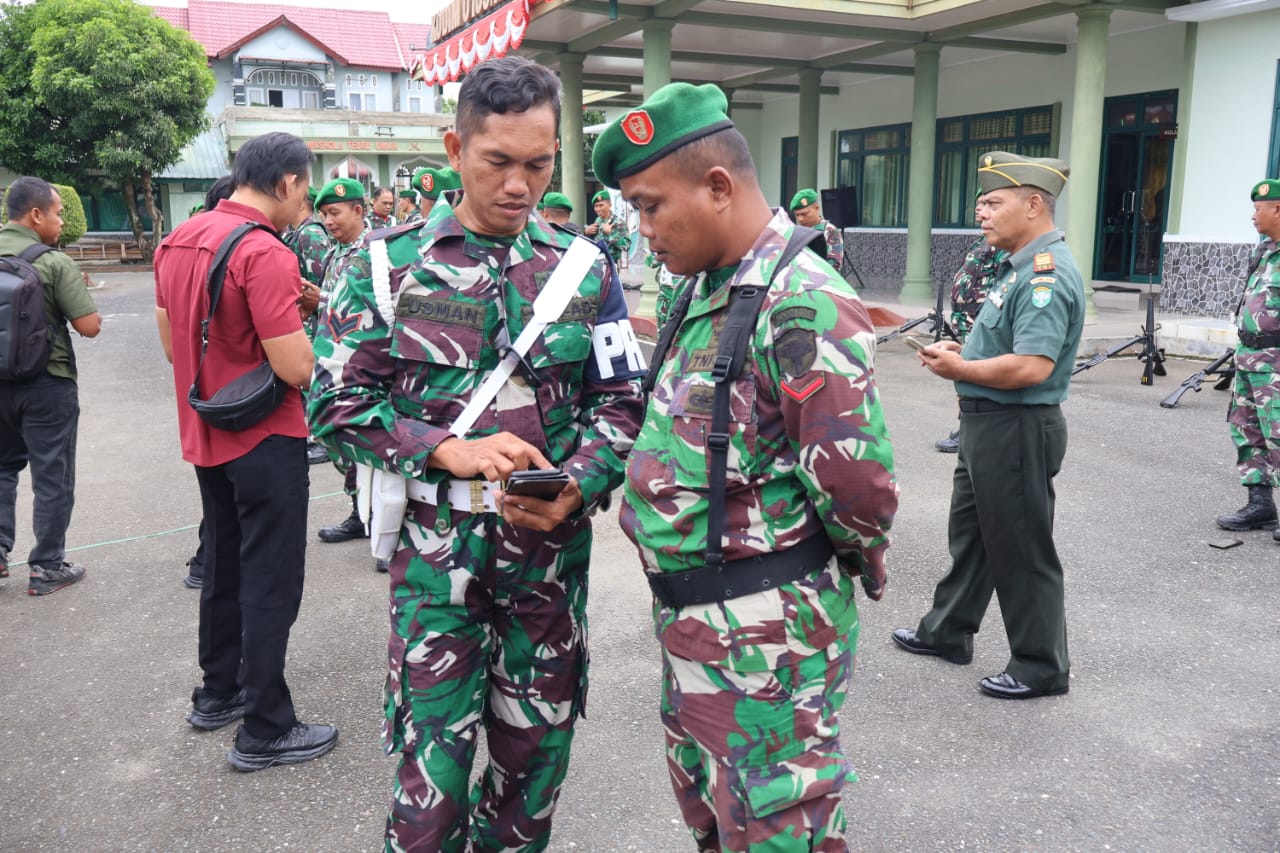 Aceh Barat – Guna memastikan tidak ada aplikasi atau pengguna situs Judi Online, Dandim 0105/Abar Letkol Inf Hendra Mirza, S.E., M.Si., diwakili Kasdim Mayor Cke Teguh Widodo mengecek secara langsung Handphone (HP) seluruh Prajurit di Halaman Makodim setempat Jalan Imam Bonjol Desa Drien Rampak Kecamatan Johan Pahlawan, Senin (4/8/2025)