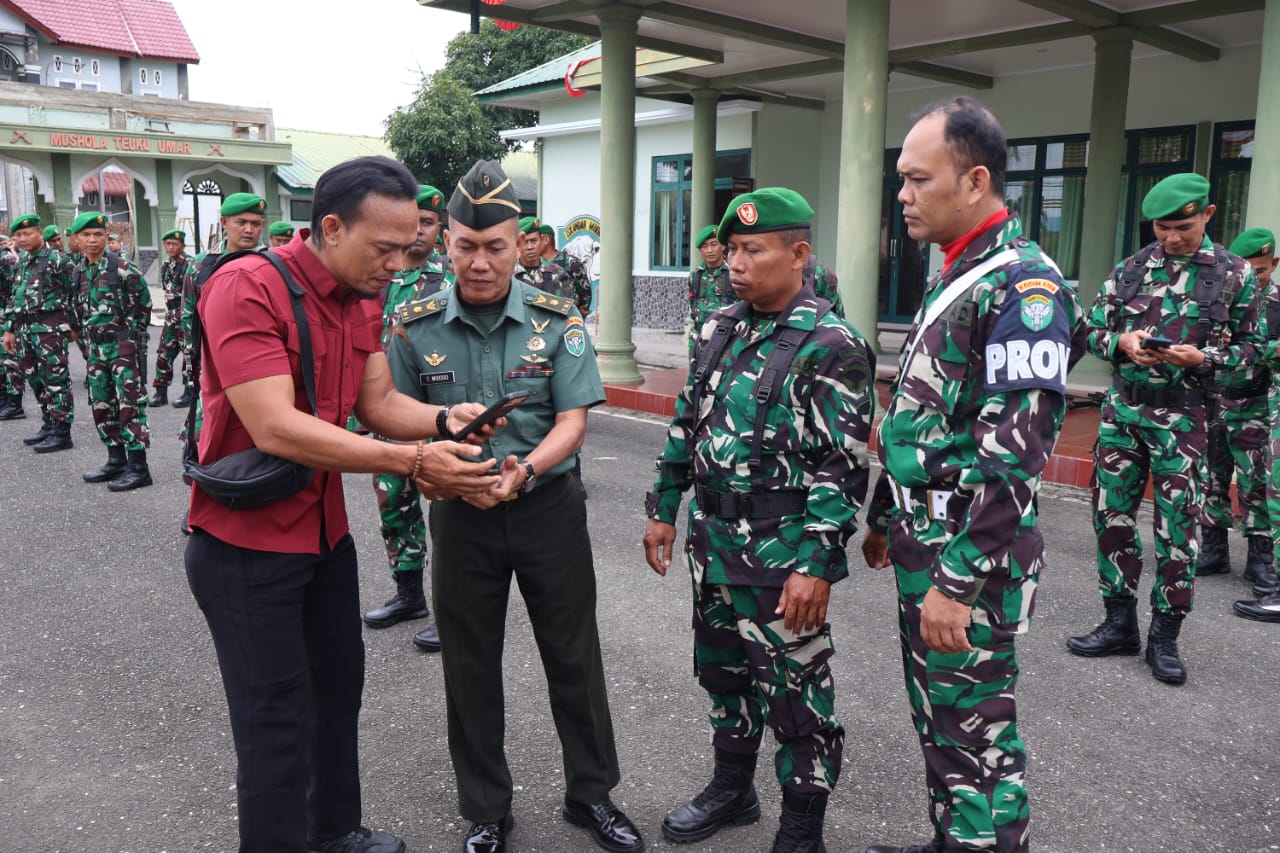 Aceh Barat – Guna memastikan tidak ada aplikasi atau pengguna situs Judi Online, Dandim 0105/Abar Letkol Inf Hendra Mirza, S.E., M.Si., diwakili Kasdim Mayor Cke Teguh Widodo mengecek secara langsung Handphone (HP) seluruh Prajurit di Halaman Makodim setempat Jalan Imam Bonjol Desa Drien Rampak Kecamatan Johan Pahlawan, Senin (4/8/2025)