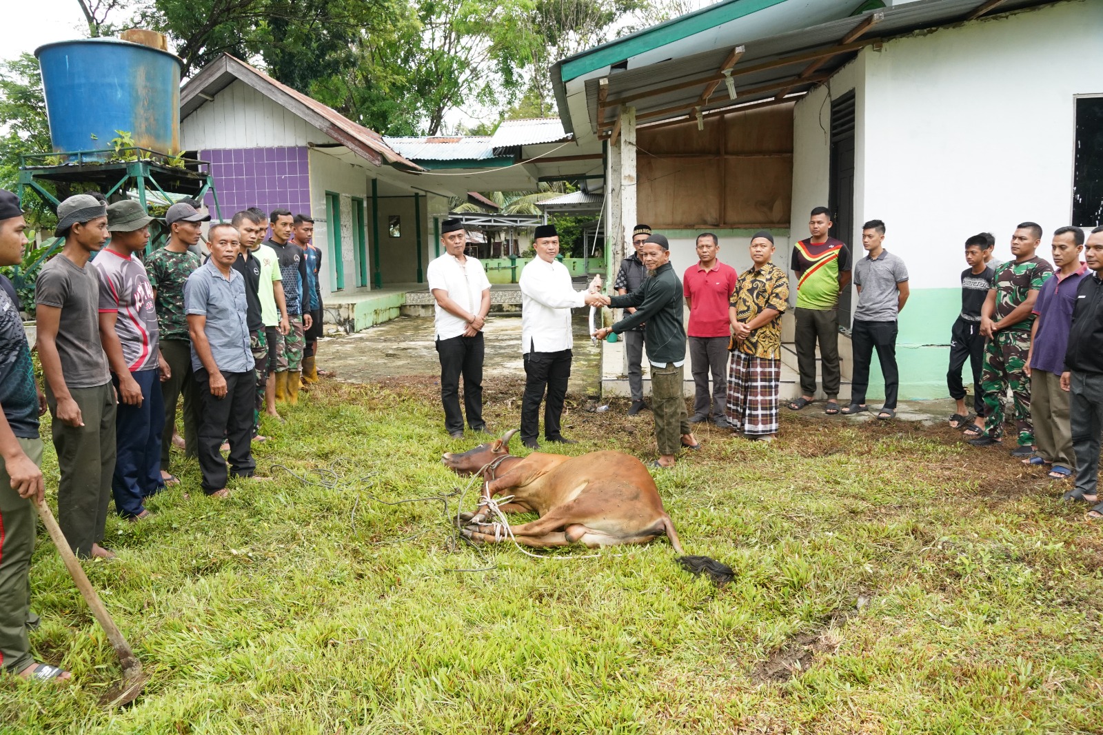 Meulaboh, Danrem 012/Teuku Umar, Kolonel Inf Deni Gunawan, menyerahkan 3 ekor sapi kepada Ustad Aan untuk disembelih dalam rangka Meugang, sebuah tradisi Aceh menyambut Bulan Suci Ramadhan 1445 H di halaman Masjid Al-Ikhlas Makorem 012/TU pada Sabtu (9/3).